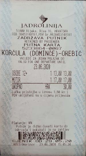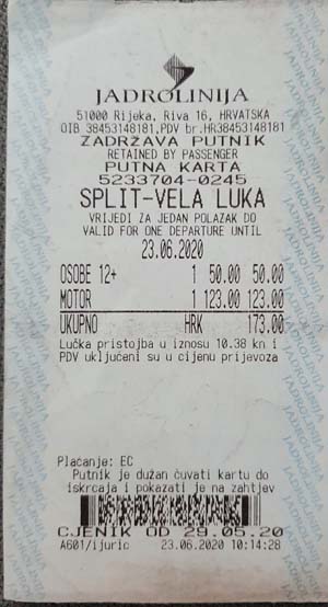 Utorak, 23. lipnja 2020. godine, treći dan. Nimalo ugodno jutro, bura puše kao i prethodni dan i večer. Spremamo se i nadamo se da je samo u Makarskoj takvo vrijeme. Gledamo prognozu i ona je na našoj strani, iako smo morali sakrivati motore u zavjetrinu dok smo ispijali jutarnju kavu u obližnjem kafiću. Naše je današnje odredište Dubrovnik do kojeg ćemo doći preko lijepe Korčule i poluotoka Pelješca. Po buri krećemo u Split na trajekt i ona nas prati sve do samog ulaska u Split, a u Splitu vrijeme ne može biti ljepše, kao da smo u drugoj državi, a ne samo 60-tak kilometara od onog ružnog vremena u Makarskoj. Dolazimo do trajektne luke gdje uzimamo karte do mjesta Vela Luka, Korčula (cijena karte za motor i jednu osobu iznosi 173 kn).