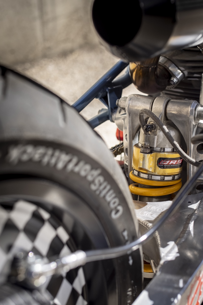 Iza stražnje strane, zakretna ruka Cagiva Elefant vodi do aluminijskog naplatka 4,5 x 17 inča, ovješenog Öhlinsovim amortizerom, a motocikl se kotrlja na gumama Conti Sport Attack 4 sprijeda i straga - uz zahvalnost Continental Spain za pomoć u sponzoriranju izgradnje.