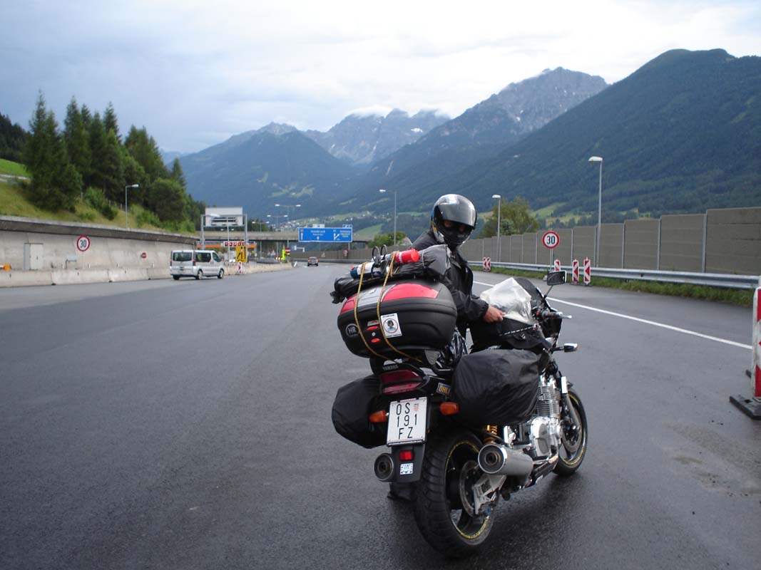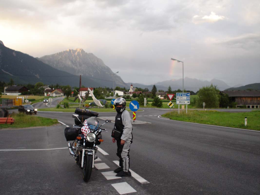 Planinski prijevoj Brenner (1375 m) prelazimo bez problema i na naplatnoj kućici dajemo 8 € za tu avanturu. U okolici Innsbrucka pojavila se duga pa smo na ćas pomislili da nam nebo daje znak da je s kišom gotovo. Tu nadu utopio nam je slijedeći oblak kojem se ovaj put pridružio i mrak, pa nam je vožnja postala još napornija.