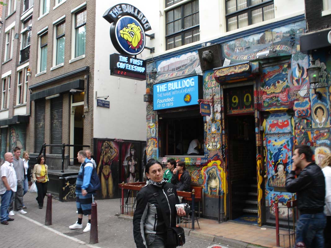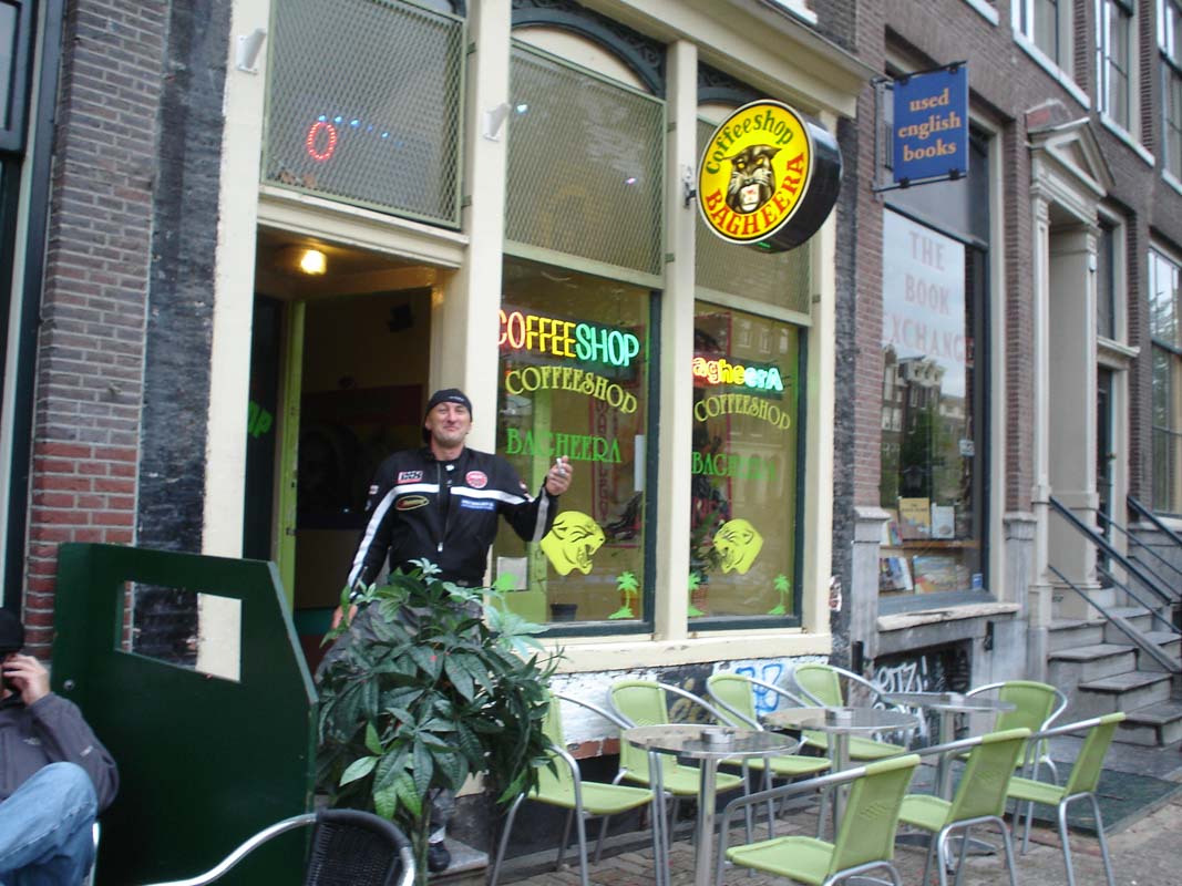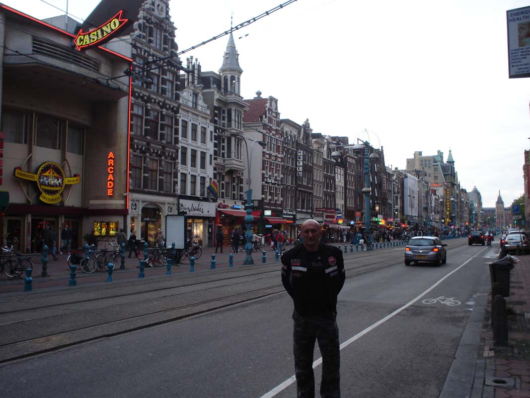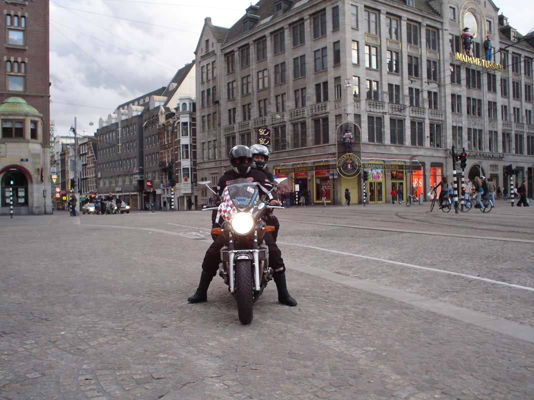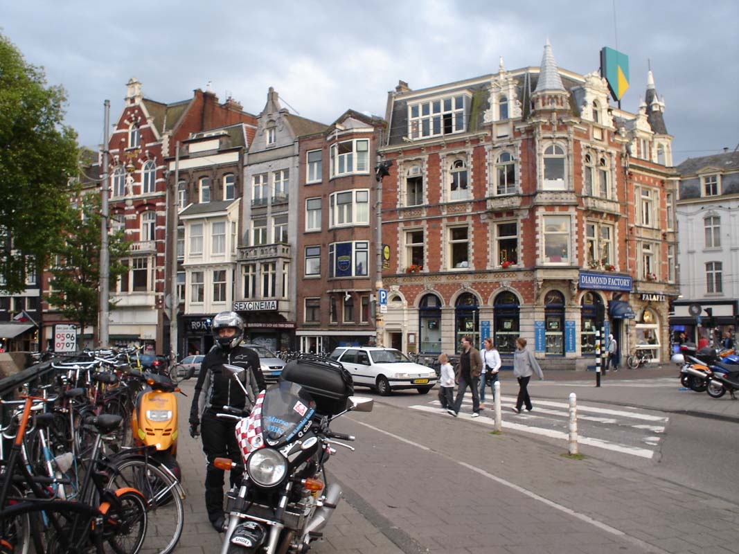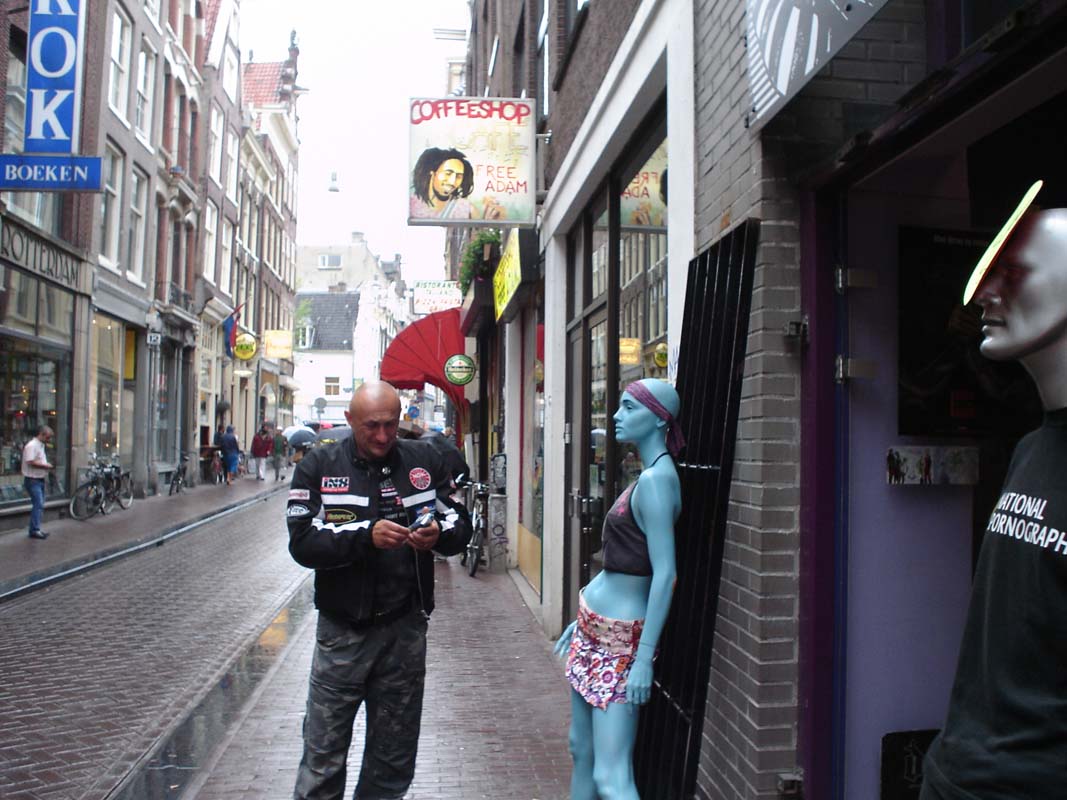 Kako je Dam glavni trg u Amsterdamu za usporedbu zamislite da parkirate motocikl na trgu Bana Jelačića u Zagrebu a da Vam pri tome policija pomaže da nađete slobodno mjesto pod Banovim spomenikom (zvuči kao utopija zar ne). Lagano sipi kiša pa odlučujemo promuvati se po trgovinama u potrazi za kakvim suvenirom. Uz put je mnoštvo coffi shopova, a razne travčice rastu na ulazima tih lokala gdje ih u keramičkim posudma brižno njeguju. Po novome zakonu na ulazu stoji upozorenje da je zabranjeno pušiti duhan koji je štetan nego isključivo čistu travu koja je ljekovita.