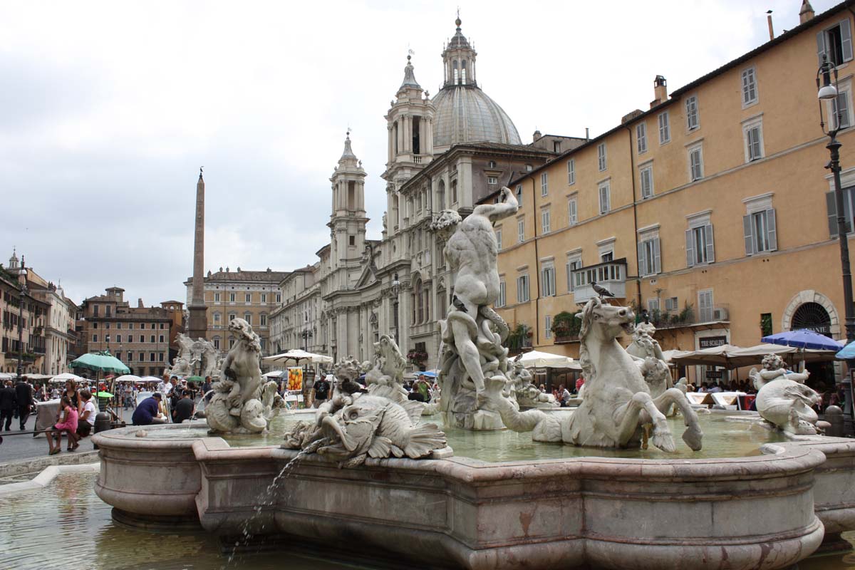 Četiri kipa koja okružuju fontanu iz 1651 god. personifikacija su četiriju rijeka na četiri različita kontinenta Ganges (Azija), Dunav (Europa), Rio de la Plate (Amerika ) i Nil (Afrika). Obelisk u sredini isklesan je od Egipatskog granita. Već prilično umorni od hodanja usput se osvježavamo na mnogim terasama caffea. Cijene su ubitačne ali nemamo puno izbora. Još par ulica i nalazimo se u stvarnom središtu Rima na sjecištu gradskih prometnica, odnosno na veličanstvenom trgu Venezia. Palaču Venezia na istoimenom trgu dao je podići Papa Pavao II koji je s njenog balkona gledao konjske utrke. S istog balkona puno godina kasnije Mussolini je držao svoje gorljive fašističke govore. Eto netko nešto i svatko u svoje vrijeme.