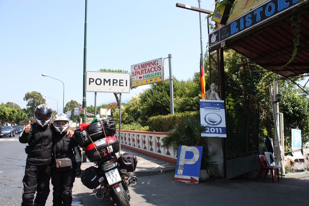 Kacige na glavi lokalno stanovništvo nema ili ih ne koristi, uključujući i policiju koja se ni ne pokušava upustiti u prometna događanja nego i oni krše zakon gdje god to mogu. Prostitutke hodaju danonoćno ulicama no na njih malo tko obraća pažnju. Nakon kraćeg obilaska grada ulazimo u povijesnu jezgru starih i uništenih Pompeja. Ulaznica je 11 eu po osobi. Već na samom ulazu zaključili smo da se radi o nekoć velikom gradu koji je Vezuv nesebično počastio gomilom lave i pepela ne ostavivši mu ni najmanju šansu za preživljavanje. Grad je građen po principu šahovske ploče i sve su ulice gotovo identične.
