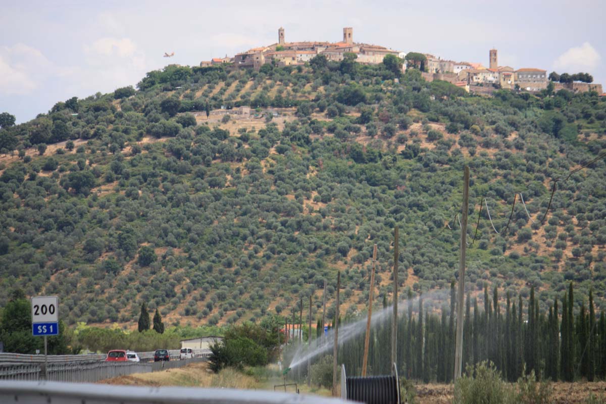 Nakon sat i pol stižemo pred Pitigliano. Vidikovac na rubu ponora nasuprot gradu obavezna je stajanka za sve koji odavde prolaze. Ovaj pogled se nemože opisati riječima. Grad se uzdiže doslovce iz stijena i doima se gotovo nestvarno. Kraj jedne fontane se rashlađujemo, a potom uskom brdskom cestom odlazimo do Sorana. Gotovo je identičan Pitiglianu i doslovno se skliže sa svoje stjenovite hridi. Slijedeće mjesto na našem putu je Sovana. Ovaj skromni zaselak je rodno mjesto Pape Grgura VII iz 11. stoljeća. Na glavnom trgu nalaze se srednjevjekovni Palazzo Pretorio i crkva Santa Maria sa freskama iz 15 st. Po okolnim brdima i dolinama nalaze se mnoge etruščanske grobnice. Kruna našeg izleta ovoga dana svakako je Saturnia. To je mjesto sumpornih izvora čija topla voda i blato bogato mineralima od antičkih vremena pomažu koži i dišnom sustavu. Tu su i istoimene toplice pored kojih prolazimo i zavojitom se cestom spuštamo do Cascata del Gorello nekih dva kilometra južnije. Ovo je zaista fantastično. Iz velike stijene šikljaju dva golema izvora tople vode. Stepenasto se preljevaju preko mnoštva cascada praveći male bazenčiće u kamenu te se slijevaju niz dolinu u toplu riječicu. Ovdje se banjamo sa mnoštvom turista do kasno popodne. Čak nam se pred kraj dana ovdje ukazao nekakav Isus. Sav istetoviran i u nekim krpama s prekriženim rukama izašao je iz Peace Brother kombija sa svojim društvom nalik na apostole i sa dvije peace sestrice. Taj vrlo loš replikant izgledao je kao da će u najmanju ruku održati Govor na Gori. Umjesto toga zapalio je joint i kada je povukao par dimova otišao je kako je i došao.“ Apostoli“ i dvije sestre odoše za njim. U drvenjari pored ovog raja pijemo Italiano esspreso i Coca-colu.