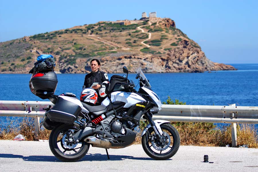 Nažalost i na veliko čuđenje nismo uspjeli pronaći niti jedan camping u ovom dijelu što nas je primoralo otići do samog rta Suniona. Cesta cijelim dijelom prolazi obalom Saronskog zaljeva a granulacija asfalta je nešto grublja od grobničke piste što je više no što svaki pravi racer može poželjeti. Ovo je nešto što se ne propušta tek tako pa koristimo priliku da iako natovareni isprobamo sve karakteristike našeg prometala. Nismo bili niti svjesni kada se pred nama ukazao veliki mramorni hram Boga mora smješten na vrhu rta Sunion okružen egejskim morem.