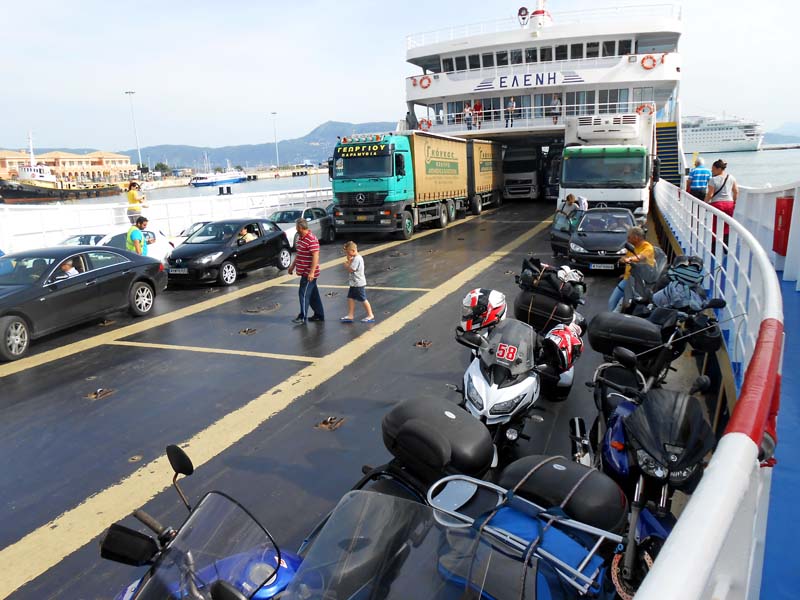Vjerujemo da će idući mjesec kamp biti pun gostiju,raditi će i restoran pa će mačja bića biti punih trbuha, a beba maca izrasti će u veliku i lijepu šarenu mačketinu. Na izlasku iz kampa Dionisius pozdravljamo se s Nikosom i zahvaljujemo mu na svemu s nadom da ćemo se i u budućem vremenu vidjeti na ovom lijepom otoku. Ferry za Igoumenitas već je na svom mjestu dok se u njega ukrcavaju automobili i kamioni. Osoblje ovog plovila raspoređuje ih takvom preciznošću da su posloženi kao šibice u vlastitoj kutiji. Vozači kamiona pravi su umjetnici manevriranja u ovakvim uvjetima. U 9,30 i mi se ukrcavamo na trajekt. Motocikli se dodatno vežu užadima za trup broda, a parkiraju se blizu pramca kako bi bili prvi pri iskrcaju. Vrućina je velika već sada ujutro pa se povlačimo u klimom rashlađeni bar trajekta. Moto hlače i jakne skinuli smo sa sebe a obukli bermude i majice kako bi barem na brodu bili komotni.