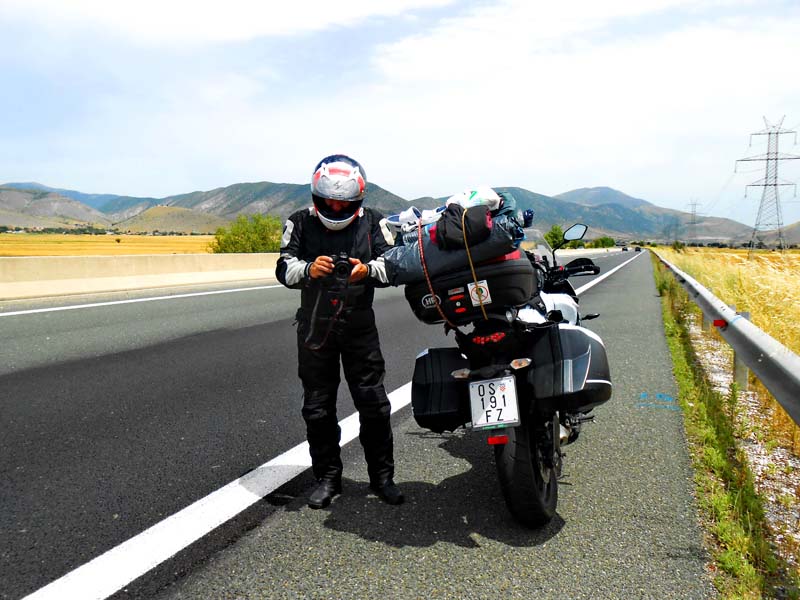 Na jednoj strmoj nizbrdici autocestu prelazi ogromna kornjača. Nismo se uspjeli zaustaviti da je maknemo sa ceste, no sigurno je uspješno prešla na drugu stranu jer smo trenutno jedini na ovoj dionici. Prilično je vruće pa se zaustavljamo samo da utočimo gorivo i popijemo nešto tekućine. Usporava nas kao što smo već spomenuli činjenica da na grčkim auto cestama nema benzinskih postaja nego su one uglavnom udaljene par km od njih. Kod Soluna se odvajamo prema Makedoniji i prolazimo pored memorijalnog spomen polja solunske bitke. U Makedoniju ulazimo gotovo bez ikakve provjere graničnih službi, jer kako nam rekoše Hrvatska je za njih europska i prijateljska zemlja te nema potrebe za carinskim formalnostima. Ostali putnici iz okolnih država bivše SFRJ zaustavljeni stoje u kolonama pod vrelim makedonskim suncem. Mi doduše imamo drugi problem jer valjalo bi podmazati novi lanac na motoru a sprej nemamo.