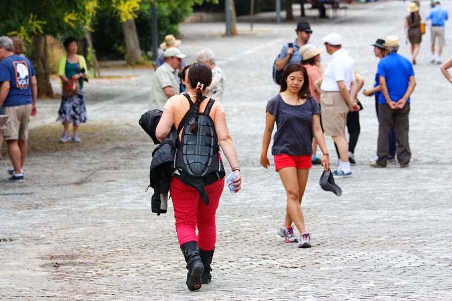 Kako bi se u potpunosti uklopili u ovaj kaos uspjeli smo sa lijevim koferom ostrugati bočnu stranicu jednog kombija dok smo se provlačili kroz gužvu jedne od prometnijih ulica. Vozač kombija mahnuo nam je na pozdrav i pokazao da nastavimo dalje. Da nam se ovo kojim slučajem dogodilo kod kuće vjerovatno bi tu bilo posla i za policiju,osiguravatelje i tko zna za koga još . U Grčkoj dok nema povređenih osoba ili dok šteta na vozilima nije takva da bi vozila ostala blokirana na cesti nema zaustavljanja nego samo vozi kao da se nije ništa dogodilo. Identičan format ponašanja u prometu imali smo priliku doživjeti u Rimu i Palermu. Metar po metar probijamo se prepunim ulicama ovog megapolisa. Nekako smo uletjeli u pješačku zonu podno Akropole te nas policajac usmjerava k mjestu za parkiranje.