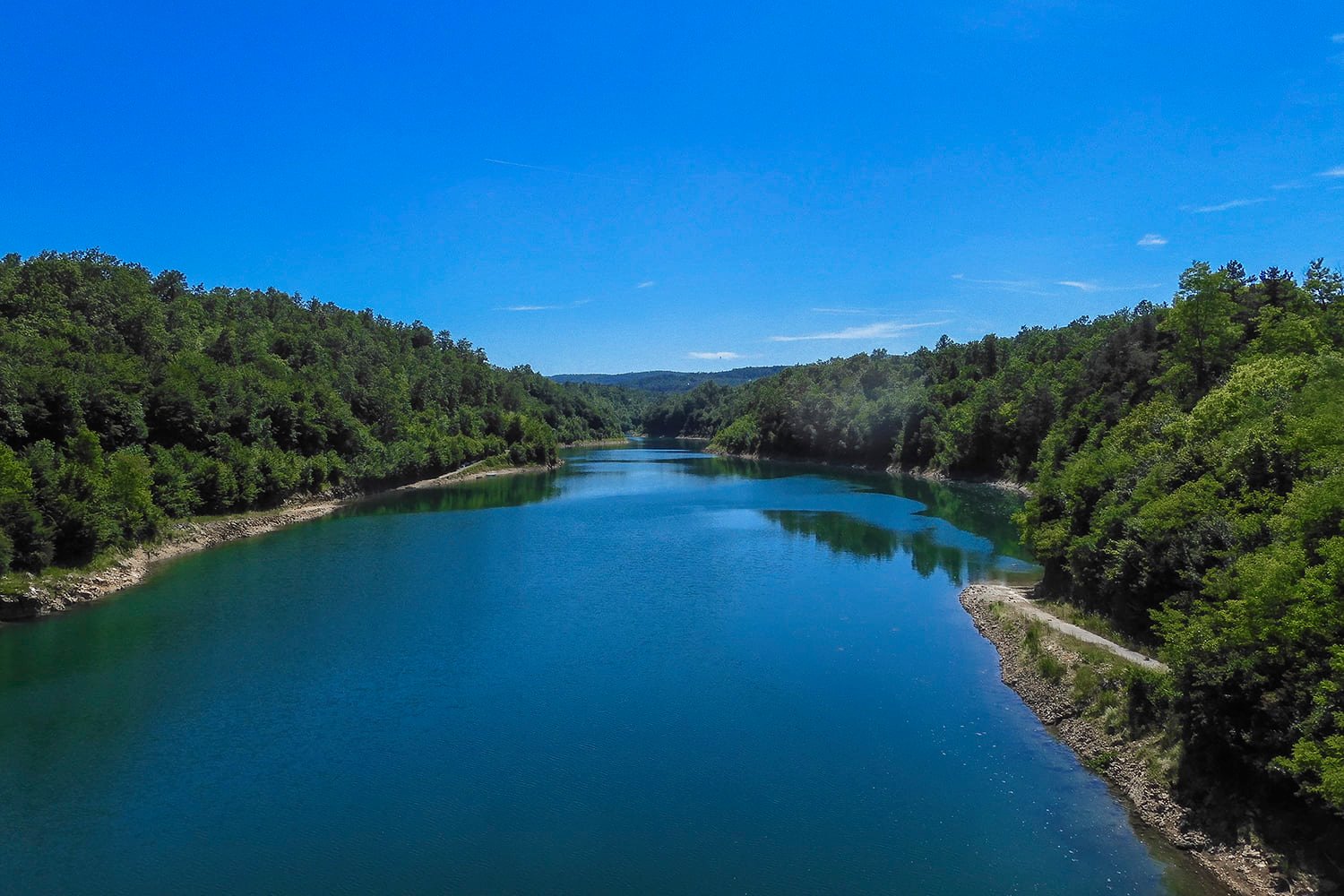 Nakon 16 kilometara podzemnog toka rijeka Dobra ponovno se pojavljuje na površini te svojom snagom napaja turbine hidroelektrane Gojak. Vrlo brzo nakon Gojaka u nju utječe druga veća pritoka, Bistrica. Zajedno se spajaju u još jednu akumulaciju hidroelektrane Lešće. Akumulacija je duga 12,5 kilometara, a cesta kojom se vozim vijuga u neposrednoj blizini. Prolazim Trošmariju, Grabrk, Podumol i dolazim u Skukane gdje se nalaze toplice Lešće. Nastavljam dalje pratiti tok rijeke i u svakom idućem selu gdje sam skrenuo cesta se dodatno suzi da bi na kraju prema Crnom Kamanju završio na šumskom makadamskom putu. Uspijevam sve proći i u Protulipi prelazim na drugu stranu te nastavljam kroz Mračin prema Jarčem Polju.