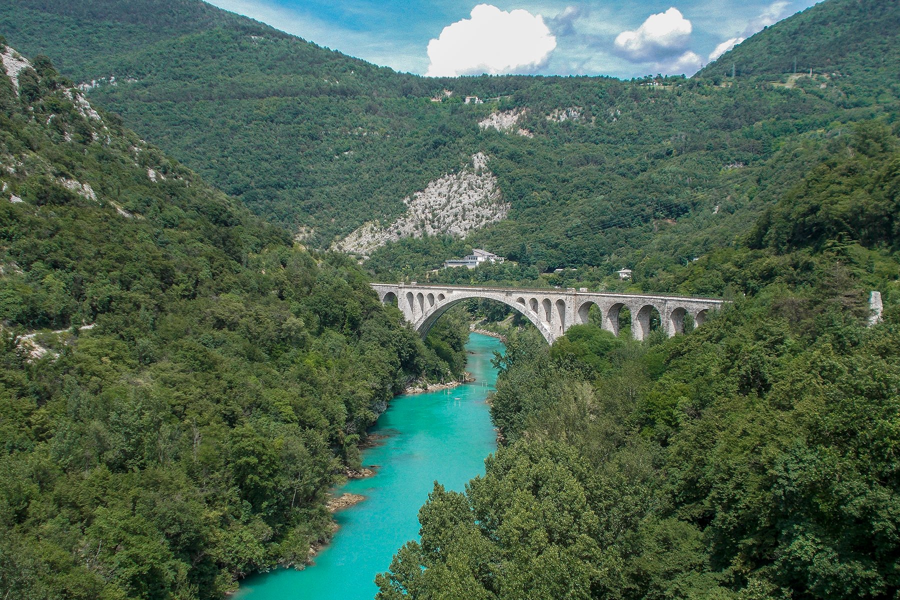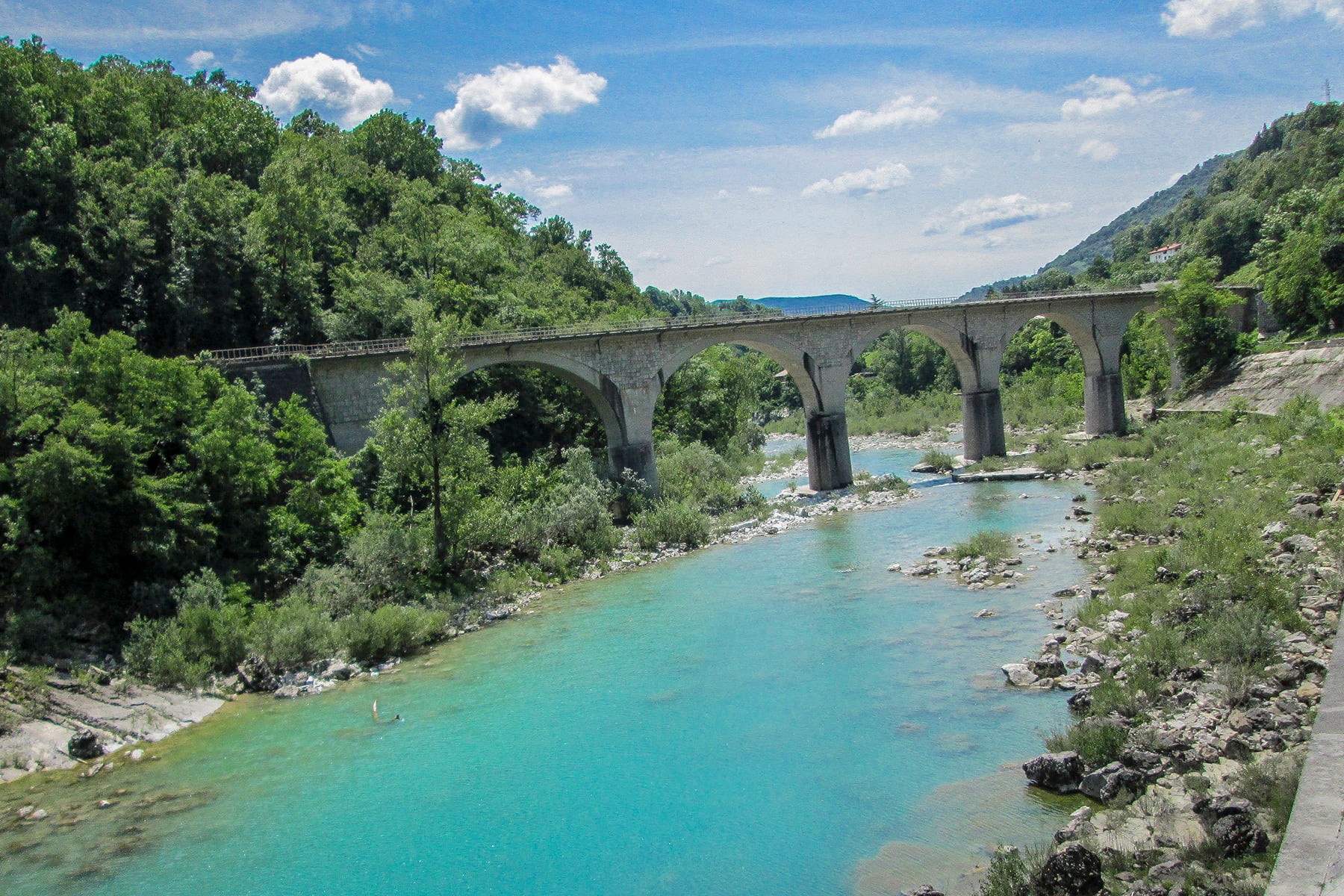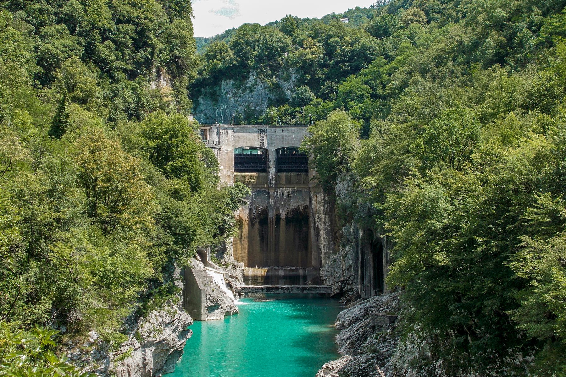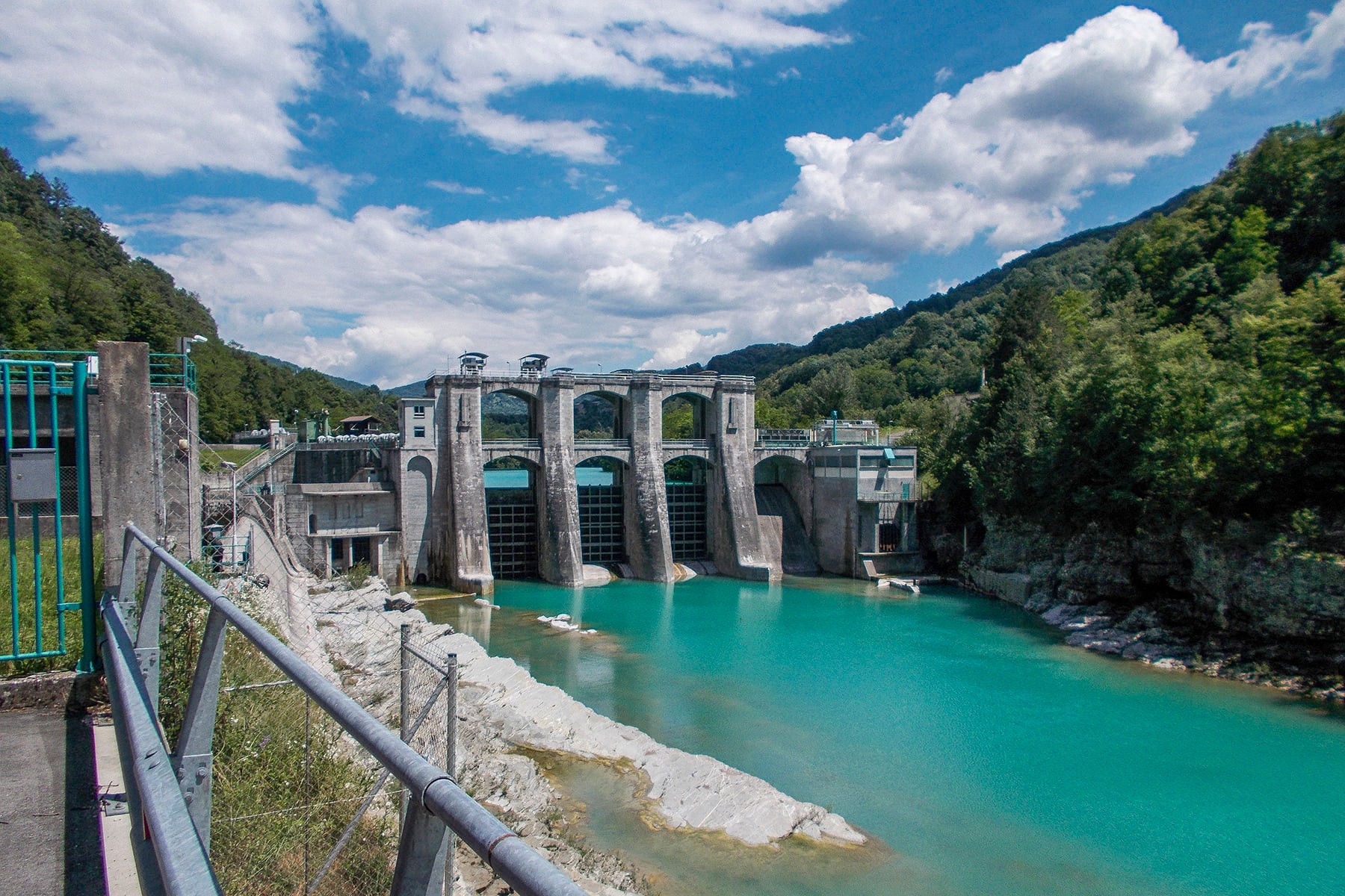 Nastavljamo prema jugu, prolazimo Tolmin i kod Mosta na Soči nailazimo na akumulacijsko jezero nastalo izgradnjom hidroelektrane. Odavde se cesti i rijeci pridružuje i pruga te sve tri zajedno vijugaju prema mjestu Kanal na Soči. U tom srednjem toku Soča je i dalje fascinantno svijetloplava i uzbudljivo brza na pojedinim mjestima.