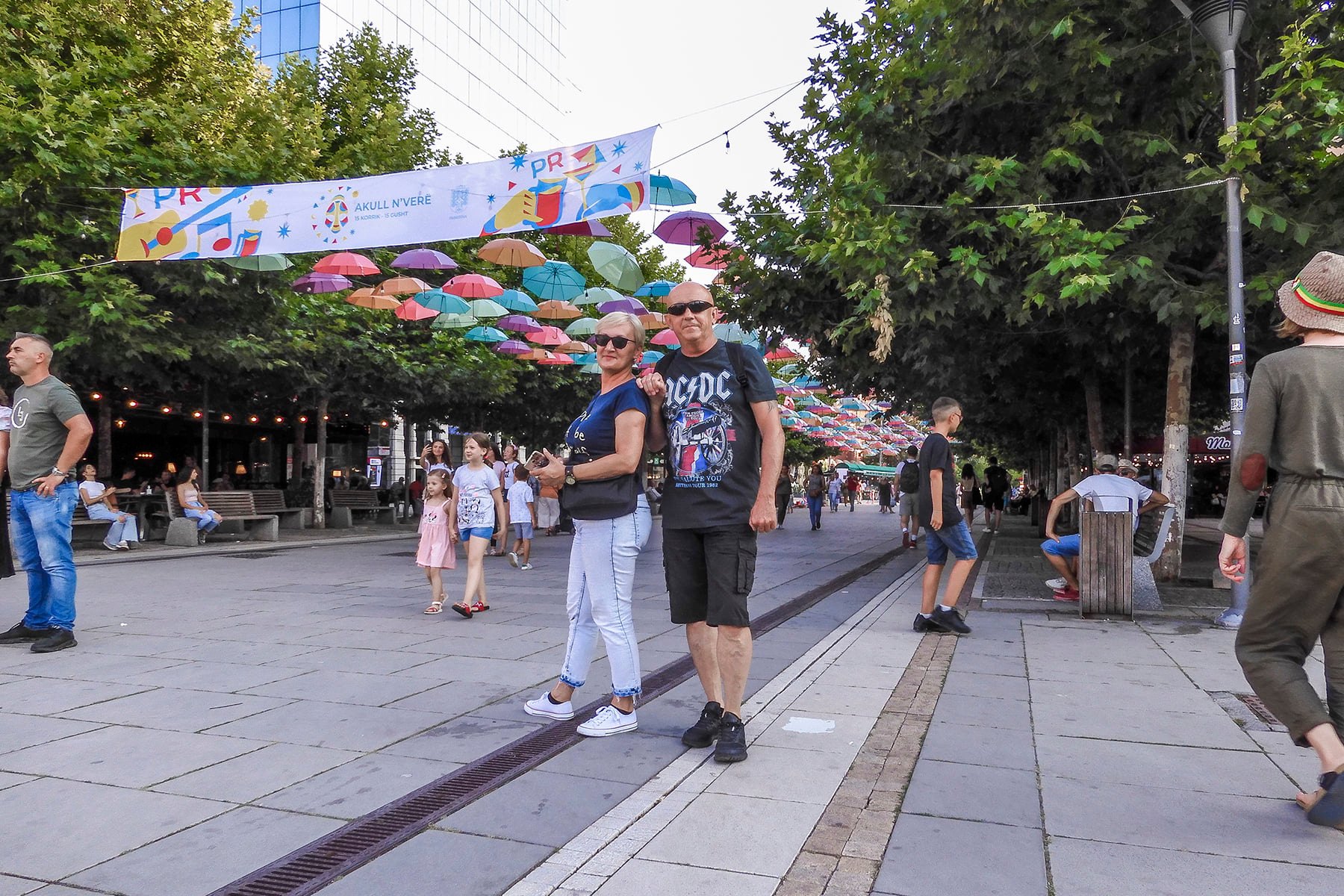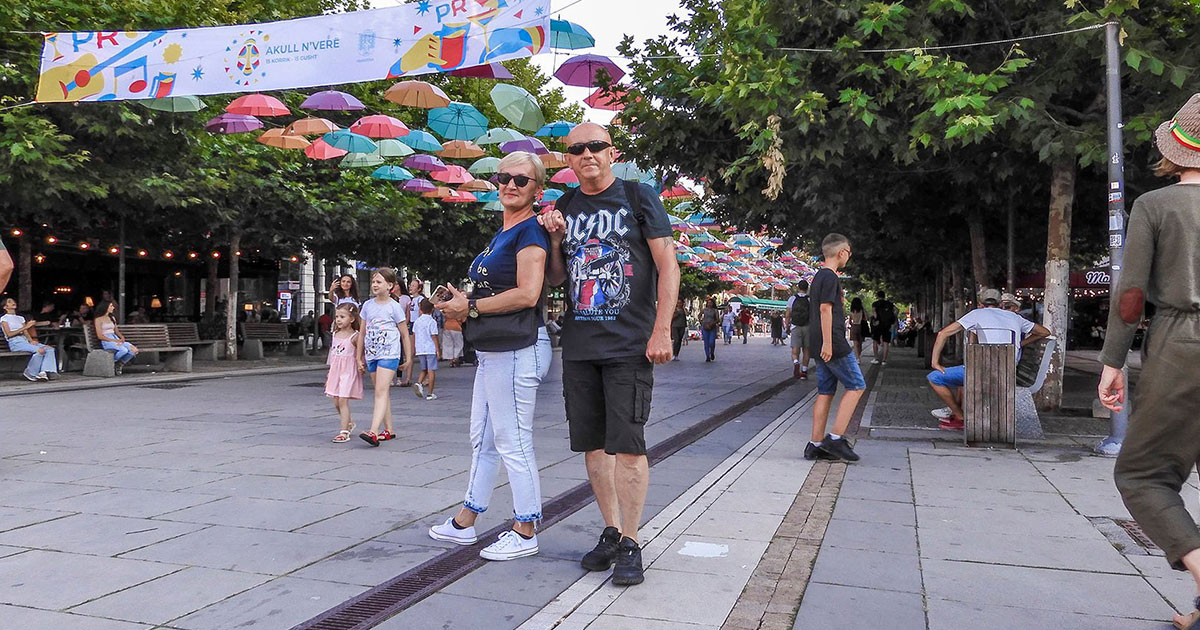 Popodnevni izlazak započinjemo šetnjom kroz najuži centar, a to je popločeni trg i ulica nadsvođena šarenim kišobranima i ukrašena fontanom u kojoj najmlađi pronalaze osvježenje u ove vruće dane. Šetamo korzom i dolazimo na Trg Ibrahima Rugove, pred Katedralu Majke Tereze. Nakon obilaska katedrala istraživanje nastavljamo u okolnim ulicama gdje su se smjestili najmoderniji butici s odjećom, kozmetikom, satovima, mobitelima i ostalim gadgetima.