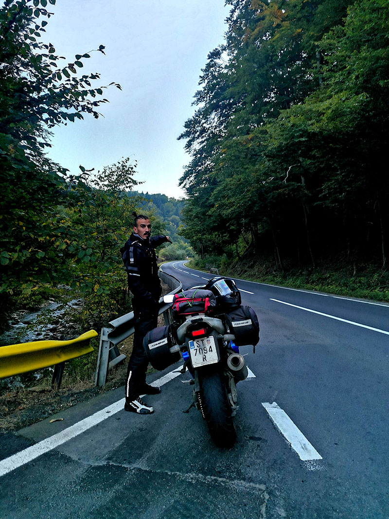 Ujutro dolazkom na branu iz top gear-a koji su sigurno neki gledali i mitova da je to brana gdje s snimao James Bond, vidim dosta motora sastrane pa odlucimo i mi stat na pus pauzu ali ulaskom na taj parking osjecao sam se kao Valentino Rossi nakon osvojenog naslova prvaka,svi su doslovno buljili u nas i dosaptavali se i gledali nas sa cudjenjem i divljenjem,neki su nas i slikavali, i sve su to bili momci sa Bmw-Gs, Honda Africa-Twin, Ducati Multistrada i njima slicni motori. Govorim ja dragoj ima bit da prvi put vide pravi motor iz japana jer sigurno nema puno ljudi sa Gsx-r om na transfargasanu sa istruganim bisagama, vrecama za spavanje, tank torbom i nas dvoje nakon 6000km.Nakon cigarete kad smo se poceli vozit uzbrdo shvatili smo zasto su nas ljudi onako gledali.Pogadjate iz dva puta.Cesta ocajna,zavoji pod 90 stupnjeva i vise i rupe u cesti u kojima R-motor bas i ne uziva dakle nema brze voznje,samo lagano truskanje kroz planine.Od tog razocarenja u startu nakon sta se priroda pocela prikazivat pocea san oduzimat gas i vozit sve sporije,cinilo mi se koda sam u nekom filmu, dokumentarcu sa dicovery-a samo jos 10 puta bolje,osta san bez teksta, samo san buljio u prirodu oko nas.Kad san se prilagodija voznja je postala prava uzivancija,da budem iskren i zaboravija san na voznju jer san mora stajati 50 puta do vrha planine da upijemo tu prirodu. Kad smo prosli tunel na vrhu nisam se htio zadrzavati jer me podsjetilo na sajam u Benkovcu i totalna komercjala prodaja suvenira pa smo odlucili kavu popit negdi manje poznato i jos uzivat u prirodi i voznji. Najljepsih 150 kilometara ikad odvozenih po svim parametrima putovanja na motoru. Transalpinu nazalost nismo mogli proc jer je taman taj dan bila zatvorena pa smo nastavili put kroz rumunjsku uzivajuci u transilvanijskom duhu lijepe ceste, krajolika,naselja i gradova.
