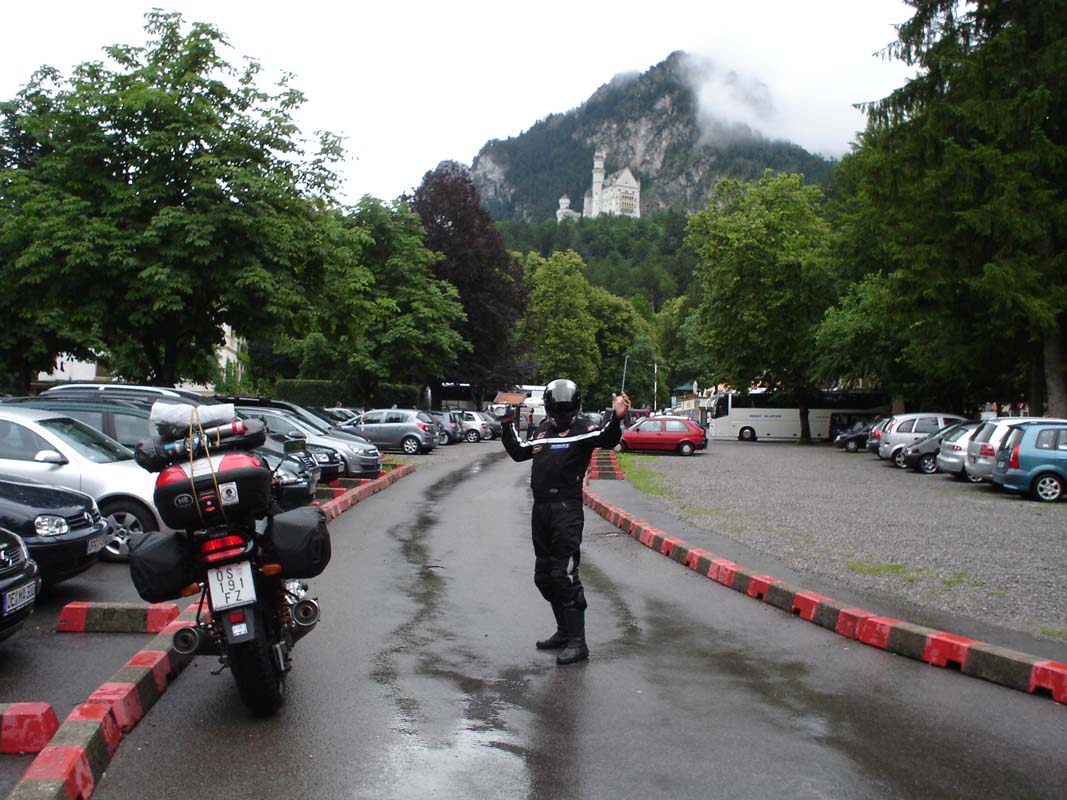 Napokon Fussen. Stajemo pod tendu jednog lokala svjesni da od campiranja nema niša. Smještaj jedva nalazimo u jednom malom obiteljskom hotelu (88 € sa doručkom). Jutro nakon potopa koristimo za posjet jednom od najljepših dvoraca Bavarske Neuswansteinu. Dakako kiša pada i dalje no ne predajemo se. Motor i opremu ostavljamo na čuvanom parkingu pa se turist. busom penjemo k dvorcu.