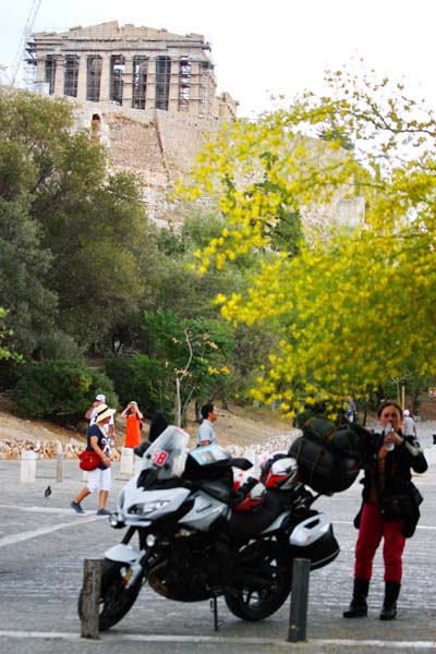 Zaustavljamo se ispod „Svete Stijene“ i hramova koji se smatraju najvažnijim spomenicima zapadnog svijeta, zbog toga što su oni imali najveći utjecaj na zapadnjačku arhitekturu. Većina ovih mramornih remek djela podignuta su tijekom Periklove vladavine u drugoj polovini 5 st. pr. Kr. u tkzv. zlatnom dobu Atene. Većina ih je posvećena Božici i zaštitnici grada Ateni. Tek što smo sišli s motora,uzeli foto opremu u ruke i pogledali štetu na bočnom koferu crni oblaci su se nadvili sa svih strana. Nije trebalo dugo čekati da se iz njih izlije tolika količina vode kakva se rijetko može vidjeti. Kao prekaljenom uživaocu kiše na motoru prvo što mi je palo na pamet bila je misao :“pa ti gdje god da odeš sobom nosiš kišu pa eto i u uvijek sunčanu Grčku“. Diosta nevjerovatno. Lije kao iz kabla. U jurišu pokušavamo spasiti što se spasiti može no već je prekasno jer kiša nas je doslovno potopila. Jedino fotiće i objektive uspjevamo zaštititi a tank torba,jakne i ostala oprema izgledaju kao da su izašli iz perilice rublja bez centrifuge. S ostalim turistima ispod neke strehe čekamo oko sat vremena da se situacija malo smiri.